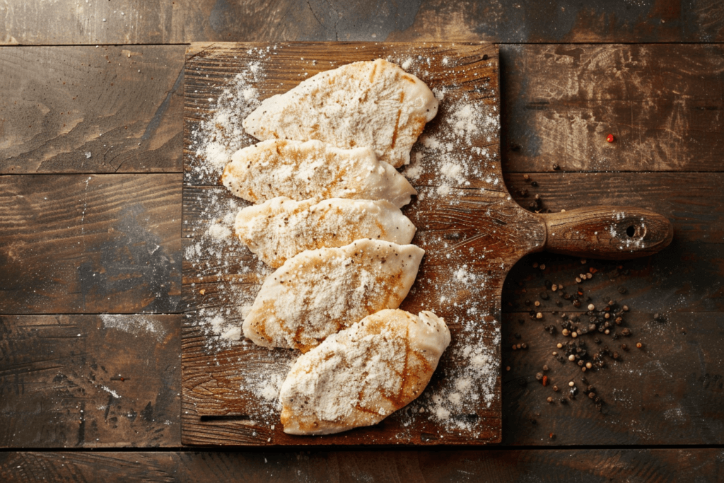 Start by preparing your chicken. If you haven’t already, slice your two large chicken breasts in half horizontally to make four cutlets. Pat them dry with a paper towel. Moisture is the enemy of a good sear, so drying them is important. Season the flour with salt and pepper in a shallow dish. Dredge each chicken cutlet in the flour, shaking off any excess. You want a thin coating, not a thick batter.