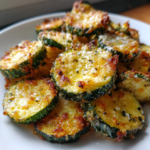 This recipe makes crispy zucchini slices in your air fryer. You use simple spices and parmesan cheese for flavor.
