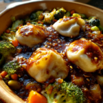 This dish combines frozen dumplings and vegetables with a savory sauce for a quick one-pan meal.